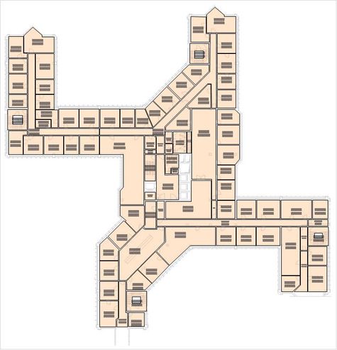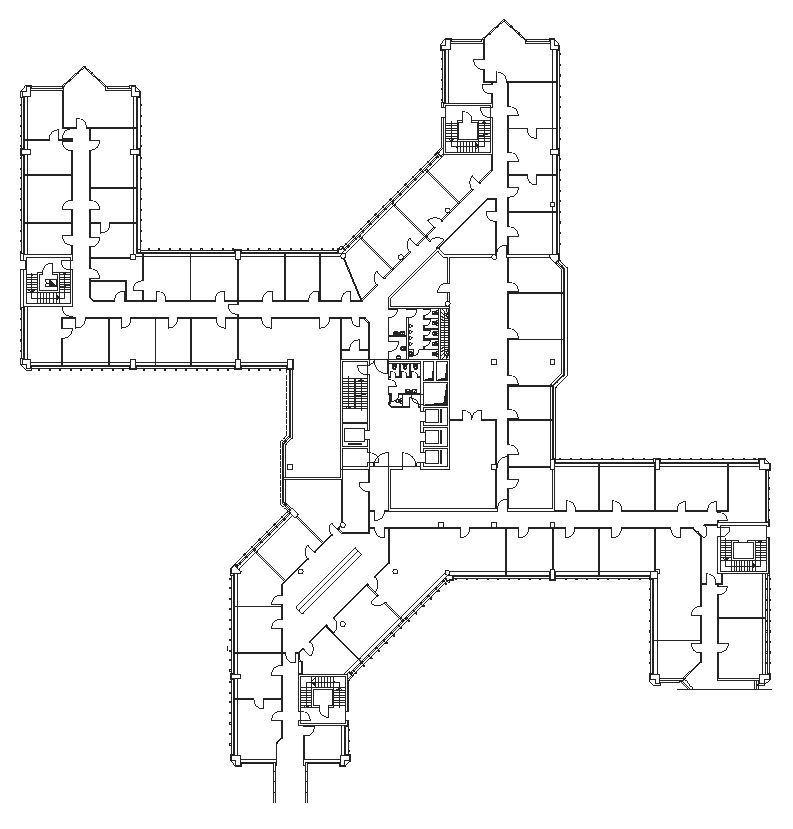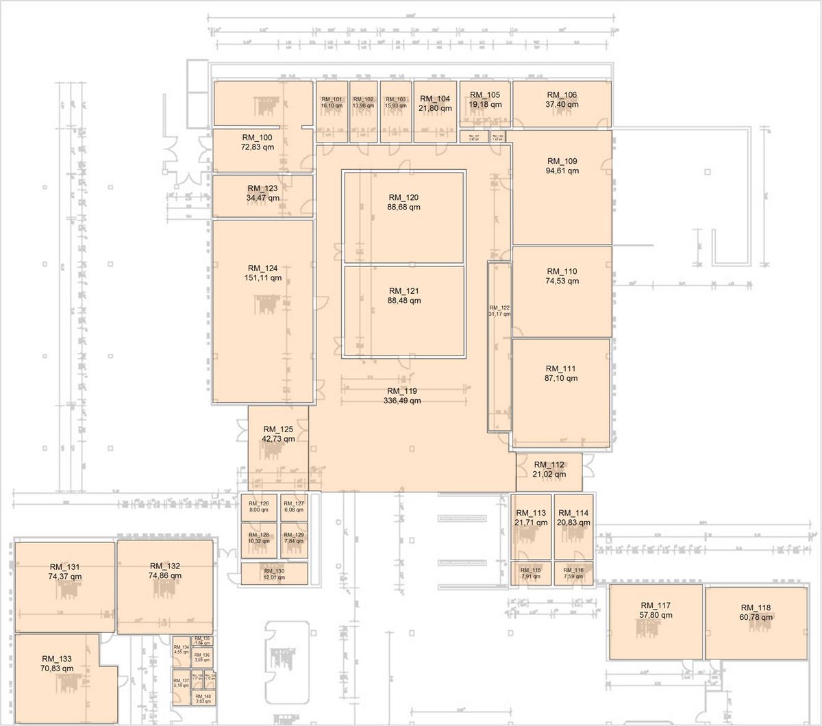 Zweites BeispielPDF-Datei eines größeren GrundrissesAuch hier wird als Arbeitsgrundlage dem Reinigungsunternehmen eine PDF-Datei übergeben. Da keinerlei Maßketten vorhanden sind, muss im realen Gebäude ein Maß aufgenommen werden, in unserem Fall der Abstand zwischen zwei Gebäudeflügeln. Dieses Maß wird in die Zeichnung übertragen und diese entsprechend skaliert. Die gleiche Vorgehensweise hätte man im Übrigen auch, wenn statt der PDF-Datei eine beliebige Pixel-Grafik (BMP, GIF, JPG, TIFF) zur Verfügung gestellt worden wäre.