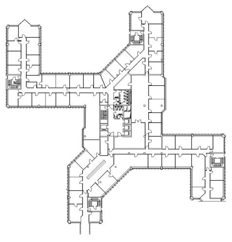 Erstes BeispielAusgangslage PDF-DateiVorgegeben war der (Teil-)Grundriss eines Stockwerkes in Form einer PDF-Datei. Dieser Grundriss wird in eine leere Visio-Zeichnung eingefügt und anhand der lesbaren Maßketten in der Visio-Zeichnung angepasst. Hat z.B. eine Tür, von der man die wahre Ausdehnung von 1,00 Meter weiß, in der eingefügten PDF-Datei eine Breite von 0,50 Meter, müßte die eingefügte Zeichnung in der Größe verdoppelt werden. Mit dem Verlegen des Grundrisses auf einen Hintergrund-Layer steht der Ausgangspunkt der Visio-Zeichnung.