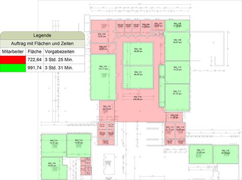 Trennung der Räume, die jeweils ca. 50 % der Gesamtzeit beanspruchen unter alleiniger Berücksichtigung des Merkmals RaumgruppeIm zweiten Beispiel wird aufgrund einer Datenbankabfrage ein interner Auftrag für zwei Mitarbeiter erstellt. Der erste hat alle Räume zu reinigen, bis ca. 50% der Gesamtreinigungszeit erricht ist, in unserem Fall 41 Räume mit einer Gesamtfläche von 1.076,56 qm in einer Vorgabezeit von 3 Stunden und 56 Minuten zu reinigen, der zweite die restlichen 48 Räume mit einer Gesamtfläche von 1.222,51 qm in einer Vorgabezeit von 4 Stunden und 19 Minuten. Bei der Berechnung der Vorgabezeiten wurde lediglich das Kriterium Raumgruppe berücksichtigt. Zur Kontrolle: Die Summe der Räume, Flächen und Zeiten in beiden Beispielen muss natürlich identische sein.
