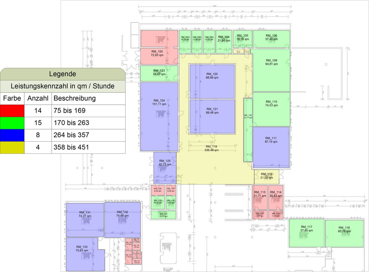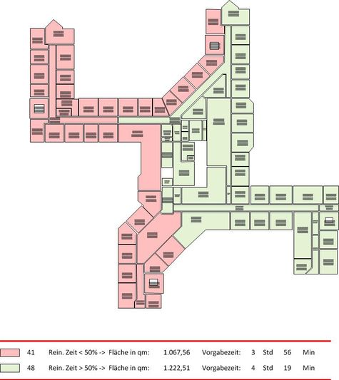 Trennung der Räume, die jeweils ca. 50 % der Gesamtzeit beanspruchen unter Berücksichtigung aller Merkmale, die auf die Leistungskennziffer Einfluss nehmenAuch hier steigen die Reinigungszeiten (geringfügig) und bei zeithälftiger Teilung muss der erste Mitarbeiter jetzt 43 statt 41 Räume, der zweite 46 statt 48 Räume reinigen, woraus zu schließen ist, dass der erste Teil der Räume (geringfügig) schmutziger und/oder dichter überstellt war.