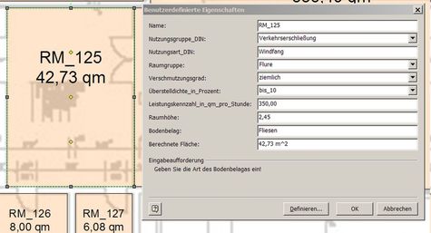 Die Eigenschaften des RaumesAlle - auszuwertenden - Eigenschaftsfelder müssen nun vom Benutzer mit Werten gefüllt werden. Einige können auch später nachgetragen werden, jedoch funktioniert die angekoppelte Datenbank nur bei Vorhandensein eines eindeuteigen (Raum-)Namens, die Auswertung der Reinigungsarbeiten nur, wenn Raumgruppen und Leistungskennzahlen vergeben wurden.