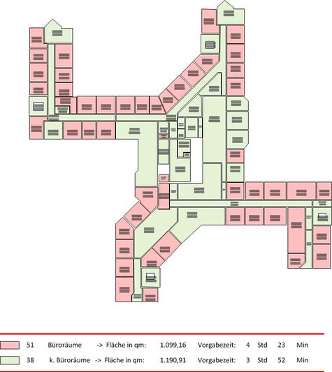 Auswertung der Räume nach Nutzungsart Büroräume und andere unter alleiniger Berücksichtigung des Merkmals RaumgruppeIm ersten Beispiel wird aufgrund einer Datenbankabfrage ein interner Auftrag für zwei Mitarbeiter erstellt. Der erste hat alle 51 Büroräume mit einer Gesamtfläche von 1.099,16 qm in einer Vorgabezeit von 4 Stunden und 23 Minuten zu reinigen, der zweite die restlichen 38 Räume mit einer Gesamtfläche von 1.190,91 qm in einer Vorgabezeit von 3 Stunden und 52 Minuten. Bei der Berechnung der Vorgabezeiten wurde lediglich das Kriterium Raumgruppe berücksichtigt.